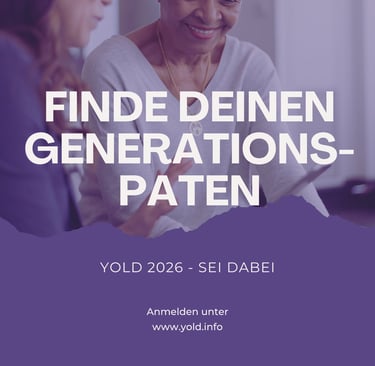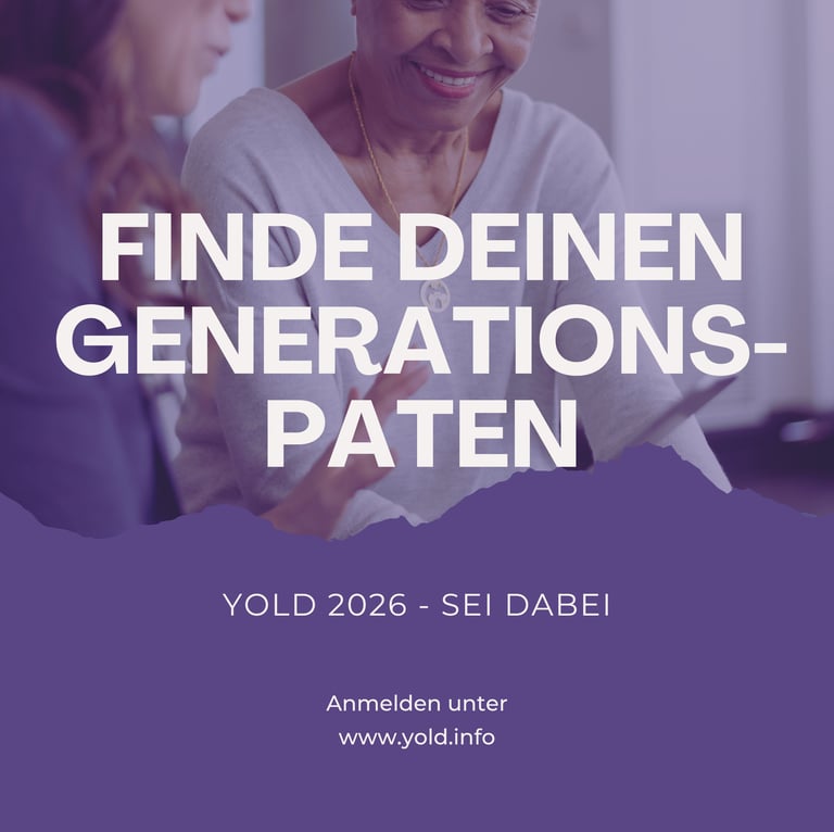 Nachdem YOLD 2025 erfolgreich in die erste Runde ging, stehen unsere Portale für 2026 offen! Sei dabei und finde deinen Generationspartner! Einfach Formular ausfüllen, Interessen angeben - fertig! Wir suchen für dich das perfekte Generationenmatch. Im Frühjahr 2026 beginnen wir mit einem gemeinsamen Auftaktevent. Alle weitere Informationen senden wir nach Anmeldung per Mail. Jetzt anmelden und dabei sein - wir freuen uns auf dich! PS: empfehlt YOLD gerne weiter! Wir freuen uns immer über neue Gesichter.